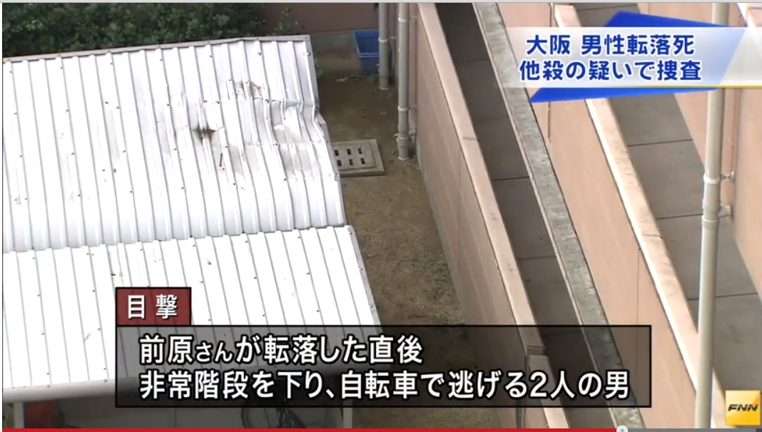 通行人が叫び声を聞いて府営住宅を見上げたところ、前原さんが7階廊下の手すりにぶら下がっており、間もなく駐輪場の屋根に落下。別の通行人が、直後に男2人が7階付近から非常階段を下り、駐輪場に止めてあった自転車で走り去るのを目撃した。言い争うような声を聞いた府営住宅の住民もいたという。